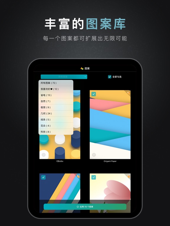 修复了一些壁纸没有被正确保存的bug。 最新: 1. 新增图案"Low Poly"; 2. 为图案列表页面新增按图案名称搜索功能。
