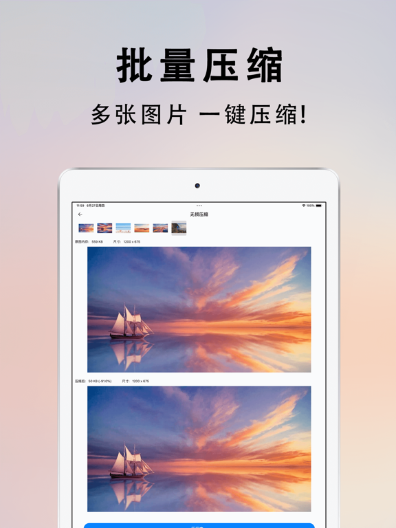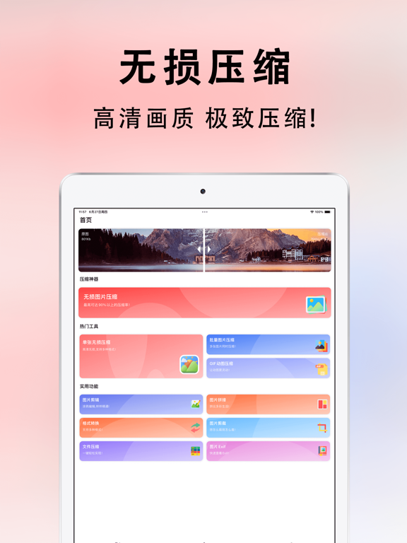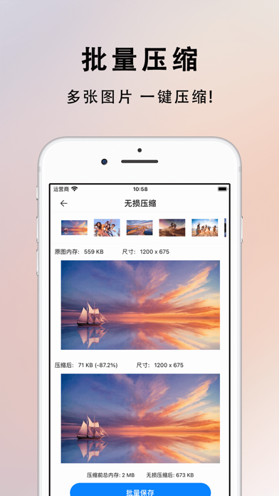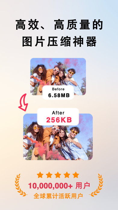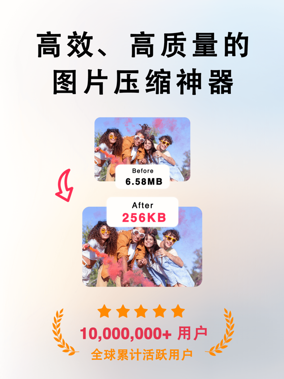 欢迎使用图片压缩大师,您的专业图片处理助手!我们致力于为您提供最高效、无损的图片压缩和多功能编辑功能,让您的图片处理变得更加简单和高效。 为何选择图片压缩大师? - 最新压缩算法: 压缩效果明显,保持图片质量的同时最大限度减小文件大小。 - 操作简便: 简洁直观的界面设计,用户体验极佳,无需专业技能也能轻松上手。 - 多功能强大: 综合多种图片处理功能于一体,满足您各种图片处理需求。 主要功能特点: - 一键无损压缩: 轻松减小图片文件大小,保持高质量无损压缩,节省存储空间。 - 批量压缩: 支持批量处理多张图片,一次性完成压缩,节省您宝贵的时间。 - GIF 压缩: 专业处理动态图片,保留动画质量的同时减小文件大小。 - ZIP 压缩: 快速打包多张图片为ZIP文件,方便分享和存储。 - 图片编辑: 提供丰富的编辑工具,包括裁剪、旋转、调整亮度、对比度等功能,轻松优化您的图片。 - 图片拼接: 合并多张图片为一张,创造出全新的创意作品。 - 格式转换: 支持常见图片格式间的互相转换,满足您不同的使用需求。 立即下载图片压缩大师,体验高效、便捷的图片处理工具,让您的图片编辑更加轻松! 订阅说明 • 您可以通过应用内的购买页查看相应的订阅价格, 升级并解锁我们的所有功能. • 付款:用户确认购买并付款后记入iTunes账户 • 续费:购买连续包月的会员账号,苹果iTunes会在到期前24小时内扣费,扣费成功后订阅周期顺延。 • 取消续订:如需取消续订,请在当前订阅周期到期前24小时以前,进入“iTunes Store与App Store”,点击“Apple ID”,选择“查看Apple ID”。进入“账户设置”页面,点击“订阅”,选择对应的订阅项取消即可。 隐私政策: https://docs.qq.com/doc/p/e9ede505fb370da3b058dc322cb9a6f598196ac4 用户协议: https://docs.qq.com/doc/p/316fdae0ce14c5090996bcd6ac43b21c2f7ebeb11. 修复已知bug 2. 优化使用