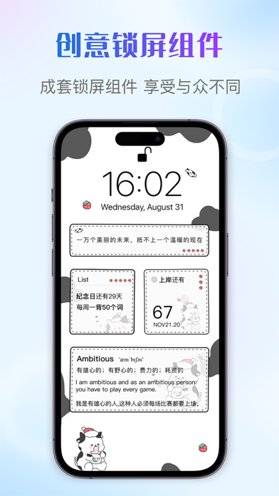 「泡芙锁屏」是一款拥有海量锁屏组件壁纸,为您精心挑选超多精美锁屏组件,满足对手机桌面不同的DIY要求,每天都是全新的开始,不用打开应用就可以每天更新,一次设置终身享用哦! [锁屏美化] 成套的锁屏主题,省去自己设置的烦恼~ 每套组件都可以DIY字体,样式,排版,颜色,透明度和背景哦~ 既满足懒人的烦恼,又解决DIY的乐趣,成就感满满~ [小刘海壁纸] 点缀刘海屏~小小的改变大大的惊喜! [超多壁纸和桌面图标] 锁屏完成想满足自己的桌面需求~ 泡芙懂你!海量的壁纸选择,任你下载。 分门别类,按类别查找更简单哦! 注意: 泡芙锁屏集成苹果健康App,用于在小组件显示健康数据。如果您要使用健康-步数/睡眠小组件,请在添加时允许APP获取健康相关数据。 [自动订阅服务说明] 订阅价格: 泡芙锁屏  VIP分为三种订阅方式连续包月、永久、年。连续包月16元/月,首次订阅16元/一个月(仅限未订阅过的用户),连续包年168元/年,永久会员98元/年。 .付款:用户确认购买并付款后计入iTunes账户 自动续费:苹果iTunes账户会在到期前24小时内扣费,扣费成功后订阅周期顺延一个订阅周期 关闭服务:您可以在苹果手机“设置”-->进入 “iTunes Store”与“App Store”--> 点击“AppleID",选 择“查看Apple ID”,进入“账户设置”页面,点击“订阅”,管理自动订阅服务,如需取消,每个计费周期结束前24小时关闭即可,到期前24小时内则不再扣费 · 用户协议:https://widgets.api.1ps.net.cn/agreement/ · 隐私政策:https://widgets.api.1ps.net.cn/privacy/修复已知问题 提升用户体验