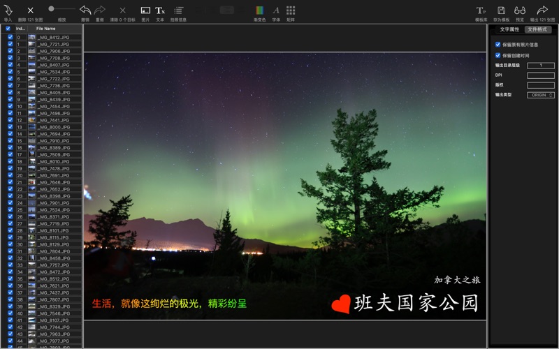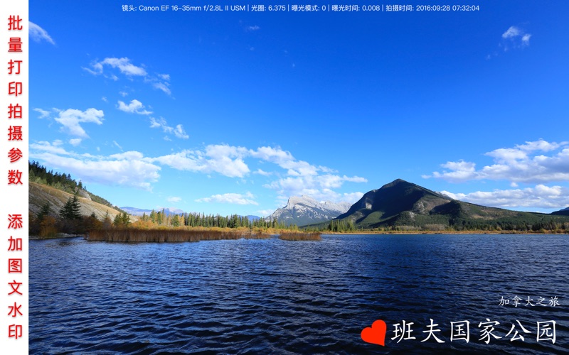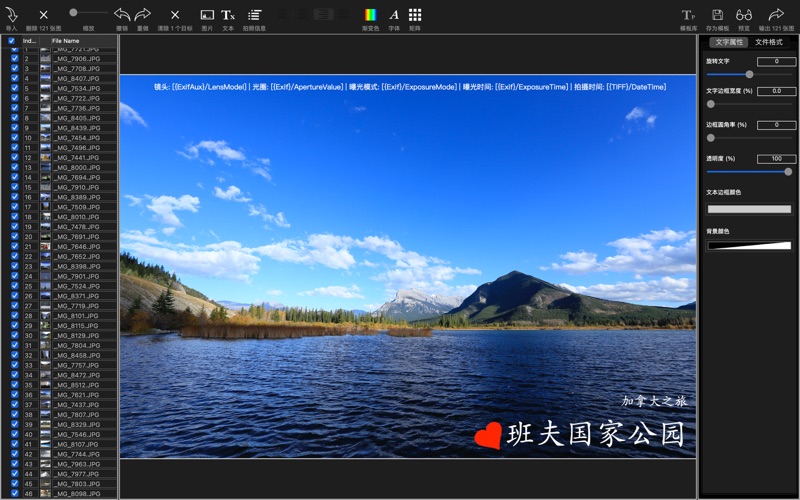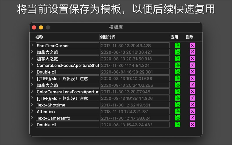 - 批量添加图文水印 - 批量打印拍摄参数,如 拍摄时间 | 相机类型 | 镜头参数 | 光圈 | 快门 | GPS 等,打印在照片上 - 将当前水印设置保存为模板,以便后续复用 如何使用: 1. 将图片或文件夹,直接拖到工具栏最左边的[导入]图标上,进行导入 2. 点击工具栏上的[添加文字]或[添加图片]按纽,再在照片上的任意位置点击,即可以该处输入文字。 3. 设置字体属性 4. 将工具栏最右边的按纽,拖出窗口,放到您想要的目录,即可将结果输出到该目录。 为纯鼠标操作用户(比如iMac、macMini)改进: 使用滑动控件批量缩放文本与水印