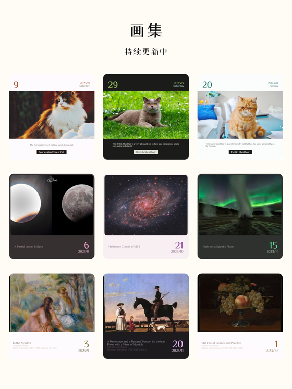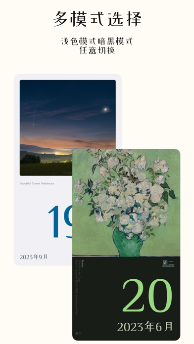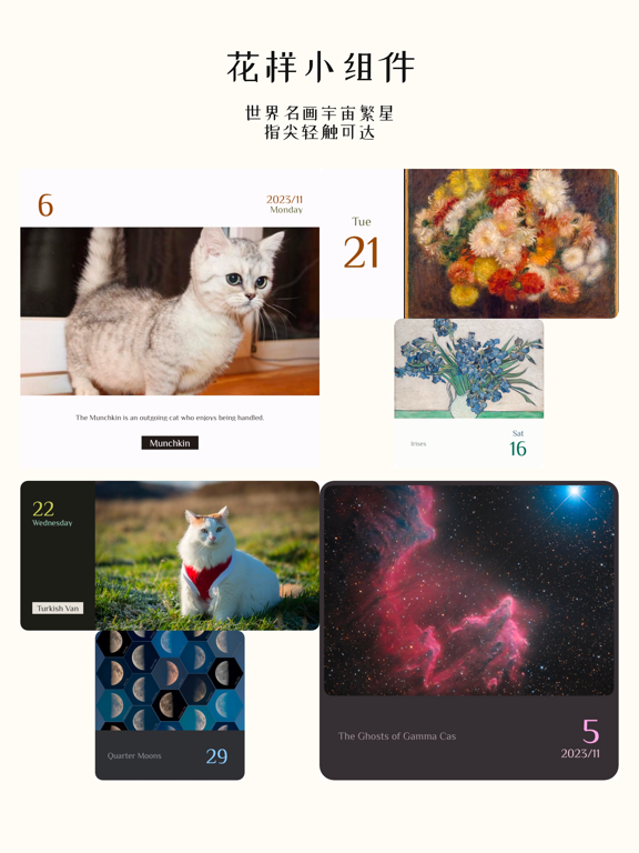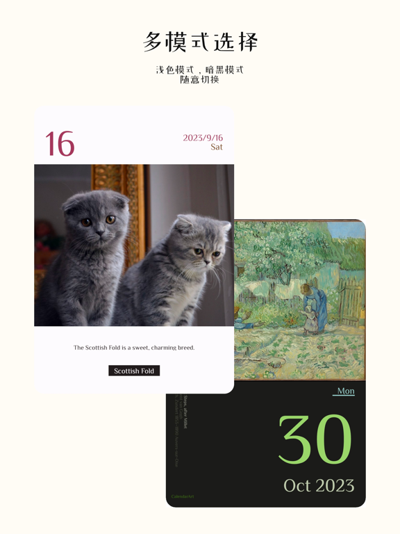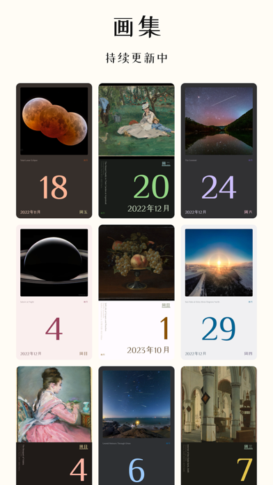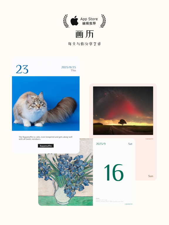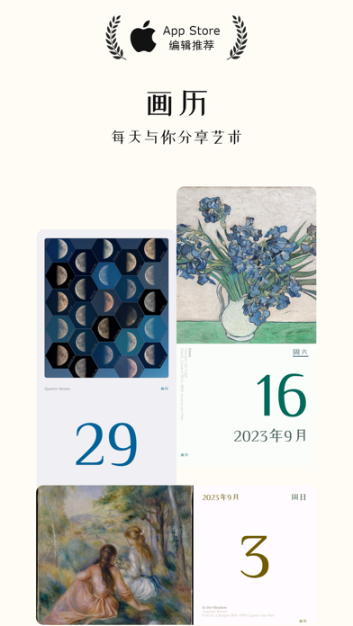 欢迎来到画历,一个让您每天都能欣赏到精美艺术画作的日历应用!画历为您带来了艺术与日历的完美结合,让您在日常生活中感受艺术的高级和美感。 每天,画历会呈现一幅令人惊叹的艺术杰作。无论是经典名作还是隐藏珍品,每一幅画作都精心挑选,并与日期完美搭配。您将享受到每天一张新的艺术画作,为您的手机屏幕带来独特的视觉享受。 不仅如此,画历还提供了精美的排版和界面设计,确保您在使用过程中获得极致的用户体验。您可以自由地浏览不同月份的画作,了解每幅画作的背后故事,还可以将您最喜爱的画作保存,随时欣赏和分享给朋友。 画历不仅仅是一个日历应用,更是一个让您与艺术紧密相连的平台。让您的每一天都充满艺术的灵感和美感,下载画历,开始您的艺术之旅吧! 特色功能: - 每天一幅精选艺术画作 - 提供极致用户体验 - 保存喜爱的画作,随时欣赏和分享 快来下载画历,让艺术点亮您的每一天! 【自动订阅服务】 确认购买后,将向您的Apple账户收费,购买连续包月、包年项目,将自动续费,Apple账户会在到期前24小时内扣费,扣费成功后订阅周期顺延至下一个订阅周期;自动订阅如需取消,请在当前订阅周期结束前24小时前关闭自动续费功能,你可以在“设置”,点击“Apple ID”,选择“查看Apple ID”,点击“订阅”选择画历VIP取消订阅即可。若出现充值未到账的情况,请将您的Apple ID和扣款凭证邮件至dev@bapaws.com; 【隐私协议】 https://privacy.bapaws.com/calendar/privacy.html 【服务协议】 https://privacy.bapaws.com/calendar/terms.html 如果您有任何建议,可以通过下面的邮箱联系到我们: 邮箱:dev@bapaws.com本次更新: - 移除广告 - 修复小组件自动刷新的问题