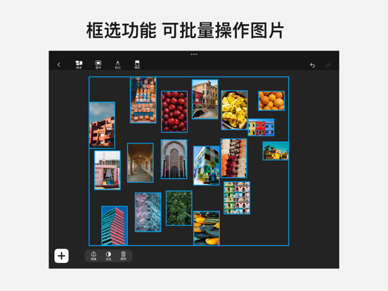 【不损失原图清晰图】 保证原图画质的前提下,优化图形显示算法,可同时查看更多图片,不错过任何高清细节。 【手写标记】(仅支持iPad) 任意位置手写标记,记录想法。 【查看图片功能】 支持图片拖动、裁剪、缩放,快捷手势聚焦单图,一键居中适应画布。 【框选批量操作图片】 批量拖动、删除、镜像、去色、排序。 【自动紧凑布局】 支持全局排序或框选排序。 【一键图片去色】 快速将选中图片去色。 【任意旋转】 支持任意角度自由旋转。 【一键图片镜像】 快速将选中图片左右镜像。 【支持分屏】 可与其它绘图类软件分屏使用。BUG修复:部分机型崩溃的问题