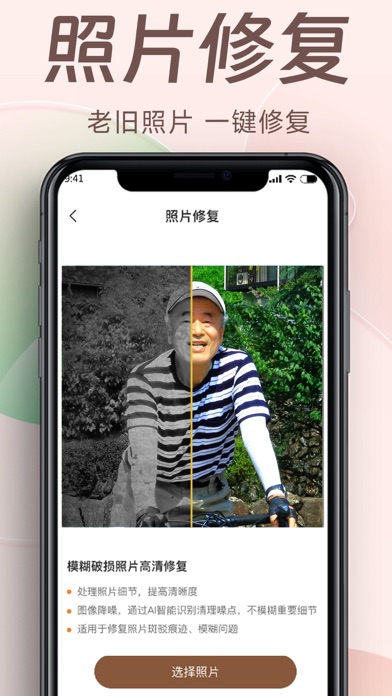老照片修复王是一款非常神奇的照片处理APP,可以将模糊的老照片修复成清晰的照片,还可以将模糊黑白的照片上色。基于强大的AI图像处理技术,极大程度地还原照片内容背后的故事,实现老照片、模糊照片、低分辨率照片画质增强,还原心中那份美好。 【老照片修复】珍贵的老照片由于时间久远变得模糊不清,使用照片修复功能可以自动修复照片并提高其清晰度。 【黑白照片上色】基于AI技术一键将照片上色,还原符合场景的颜色,将珍贵的黑白照片添上美丽色彩。 【漫画脸】老照片修复王不仅仅是一个修复工具,还是照片编辑神器,一键生成专属于你的漫画脸。 【性别转换】想看看平行时空另一个性别的你长相如何吗,使用一键性别转换功能,美丽的你就是可盐可甜、可萌可飒! 【连续订阅会员说明】 1.订阅服务:连续包周、包月、包年会员 2.订阅周期:1周/1月/1年;订阅周期内,用户可享受VIP会员功能 3.订阅价格:周度28元,月度48元(包含折扣优惠首月12元,次月48元),年度88元(包含3天试用后每年88元) 4.付款:确认购买后,将从用户的苹果iTunes账户扣费 5.取消订阅:若需取消自动续费,请在订阅周期到期前至少24小时关闭自动续订,关闭后不再扣费若未在到期前24小时取消,将自动续订 6.续订:连续(包周/包月/包年)会员到期前24小时,苹果会自动为您从iTunes账户扣除相应费用,成功后(包周/包月/包年)会员服务有效期自动延长一个周期 隐私政策:https://docs.qq.com/doc/DRWRNdUpydEhFeXpu 用户协议:https://docs.qq.com/doc/DRVNJbllTbnpMYnBt1、公共SDK升级 2、修复已知问题