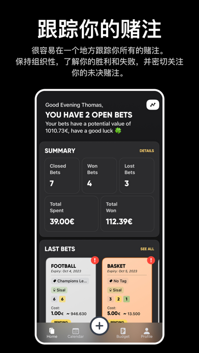 像职业玩家一样追踪你的投注——Betty 是你理想的体育投注追踪助手! Betty 是一款多功能的 投注追踪应用,专为希望 管理投注历史、控制 投注资金 和优化 下注策略 的用户设计。无论你是新手还是资深玩家,Betty 都能帮助你轻松追踪每一笔投注。 你值得信赖的体育投注追踪工具 • 全面记录各类投注:赛事、类型、赔率、金额、结果 • 添加自定义投注类型、结果、赔率和下注金额 • 用标签、分析师和博彩公司对投注进行分类 • 查看详细统计数据:ROI、胜率、盈亏情况 • 独立追踪每个投注事件的详细信息 • 支持多种赔率格式:十进制、分数、美式 • 按联赛、运动类别、比赛进行数据分析 • 掌握下注趋势,优化投注决策 • 设置目标并实时追踪进展 • 智能管理你的 bankroll,避免超支 • 导出投注记录(可按日期或类别筛选) • 多设备云同步,随时随地查看数据 有了 Betty,你再也不会错过任何一次投注。我们为你提供完整的数据追踪功能,帮助你不断提升自己的投注能力。 无论你是专注于 体育博彩、热衷于 分析赔率与博彩平台,还是只是希望把所有投注集中管理——Betty 都是你最佳的个人投注助手。 为什么数千位玩家选择 Betty • 界面简洁直观,使用体验极佳 • 支持所有主流运动项目和博彩公司 • 快速录入和编辑投注单 • 智能提醒,及时更新投注结果 • 高级过滤器,便于查看投注历史 • 非常适合认真对待下注的专业用户 想要 记录投注历史、分析胜负数据、管理 bankroll 并提高下注效率?Betty 是你的不二之选。 ***** “Betty 彻底改变了我的下注方式,强烈推荐!” ***** 立即下载 Betty —— 帮你轻松追踪每一次下注,掌握自己的博彩节奏。 使用条款:https://www.apple.com/legal/internet-services/itunes/dev/stdeula/错误修复和改进