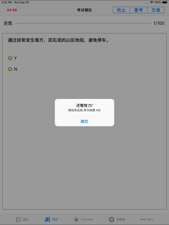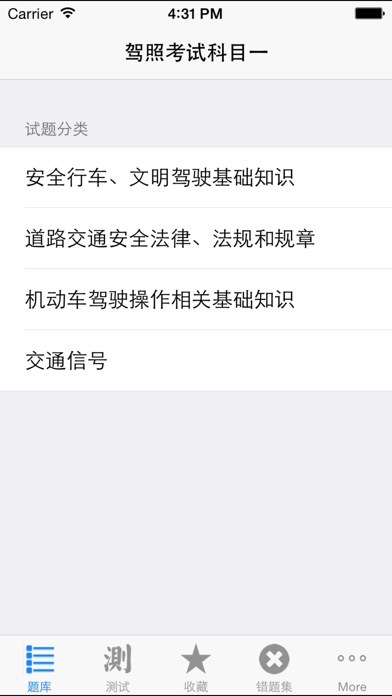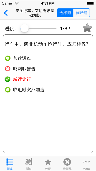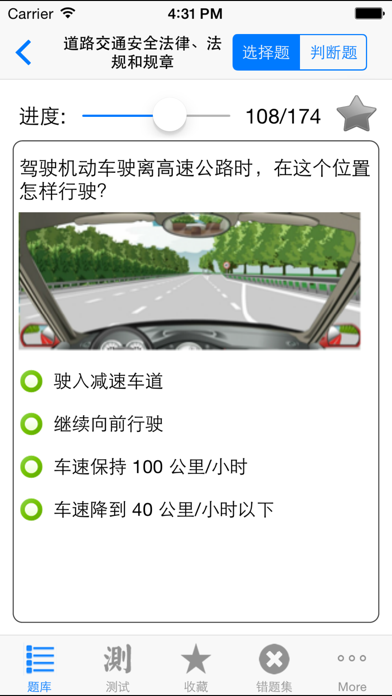 为您收集最新全国通用科目一题库。包含四大类,目前共900多题。 请注意题库会随时调整,不能保证完全一样。 * 分类学习: 题目分门别类,每类选择题与判断题可随时切换 * 模拟考试: 按照考试规定章节随机生成100道题库真题,模拟真实考试场景 * 错题汇总: 自动保存您答错的题目,便于复习强化 * 我的收藏: 可随时收藏您觉得需要加强记忆的题目,便于学习 * 交通标志大全: 收集最常用的交通标志, 实用又方便!适配iPad全尺寸/横竖屏 适配iOS13