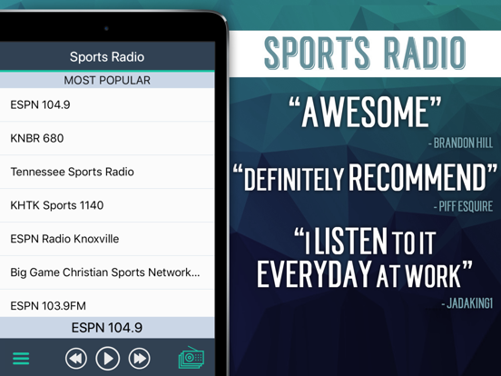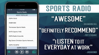 体育电台 - 热播美国广播电台音乐(20 电台) 提供下列电台: ******** Sports Radio ******** E.S.P.N. 1300 KNBR Tennessee Sports Radio Patriots.com Radio Sports 620 KTAR Sports 1140 The Fan SportsRadio 610 Houston Nashville Sports - The Zone 92.3 The Fan - Cleveland 95.7 The Game - The Bay Area 97.1 The Ticket 97.5 The Fanatic - Philly's Sports The Sports Hub - Boston Sports ********** Leftovers ********** 670 The Score Tennessee Sports RFENC 105.9FM Sport Total FM WJOX - Birmingham Sports ASLN Radio TalkSuperstation.com WNML - Knox Sports Animal For more information, including Terms of Service & Privacy Policy, visit myindieapp.com. Thanks for listening! 请尽情享受!• Latest iOS Support • Bug Fixes & Improvements