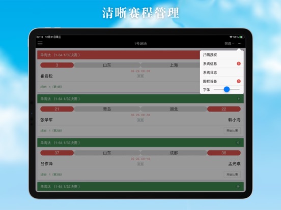 赛场裁判员执裁电子执裁终端系统,羽毛球、乒乓球、网球、匹克球、篮球、排球、气排球等赛赛的专业级赛场执裁终端。依托EMMS赛事管理系统可完成专业级赛事的裁判员执裁工作。EMMS赛事管理系统以“运动员”的注册信息为基础,应用信息化手段,实现各单项、团体赛事的远程报名、扫码支付、运动员审核、电脑抽签、秩序册自动生成、现场编排、电子执裁、现场屏显、比分呈现、现场打印及成绩自动化处理、成绩册自动生成、成绩信息的即时发布、综合成绩(名次、总分、奖项情况)的即时统计与发布等功能,可规范赛事事物的管理,并可大大减轻赛事组织的工作量及时效性。- 优化设备授权方式; - 优化系统升级的鉴权方式; - 修复设备授权后缓存比赛信息不准确的问题; - 修复已知Bug。