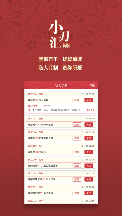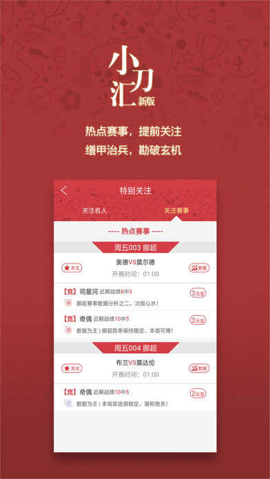 小刀汇是一款足球赛事资讯服务应用 1、 全球主流赛事一网打尽。 2、 汇聚行业实力专家,关小刀、书香公子、老狗等倾情加盟,群英荟萃,各显神通。 3、 个性化关注,方便用户随时订制喜爱的专家或赛事信息。 4、 小刀汇注册用户,均可参与演武堂举办的各种活动,与全国球友交流切磋。 5、 名人手记、收风站等实用功能向所有用户免费开放。1.设置里新增可修改用户名功能 2.性能优化,已知bug修复