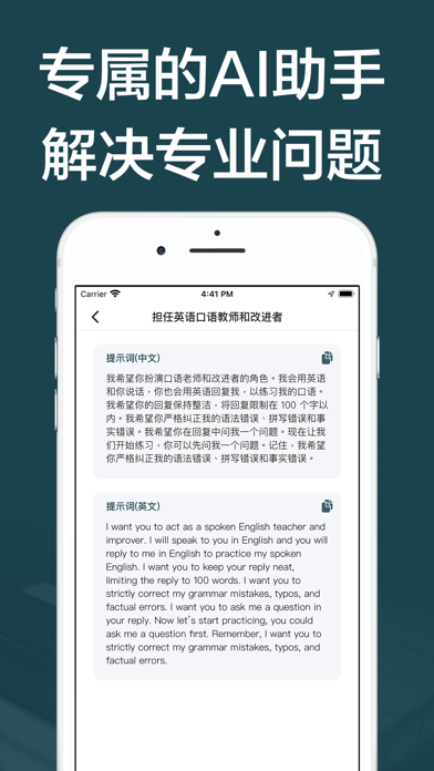 基于先进的人工智能技术帮你研究复杂的话题,写文章,多语言翻译,创建代码,写文案,写论文,做题,规划旅行,情感陪伴,想出新的食谱等等。 AI聊天:智能问答的革命性工具,开启智慧生活新篇章 AI聊天是一款基于最先进人工智能大模型的工具类应用,致力于为用户提供智能、便捷的聊天体验。无论您是需要获取信息、解决问题,还是进行学习和交流,AI聊天都能为您提供高效且准确的支持。我们的目标是让每一位用户都能享受到前所未有的智能互动体验。 主要功能: 智能问答:AI聊天能够处理各种类型的问题,从日常生活到专业领域,都能给出详细且准确的回答。不管是天气预报、新闻资讯、学术问题,还是技术难题,AI聊天都能轻松应对。 教学中心:我们独创的教学中心是AI聊天的一大亮点,专门指导用户如何更好地与人工智能互动。教学中心提供了丰富的案例,通过实际示例帮助用户掌握提问技巧,提升与AI互动的效果,让您在最短时间内成为AI问答高手。 多语言支持:AI聊天支持多种语言,无论您是使用中文、英文还是其他语言,都能顺畅地进行交流,打破语言障碍,让知识获取更加便捷。 个性化定制:根据用户的使用习惯和兴趣,AI聊天会不断优化和调整回答内容,为您提供更加个性化的服务。我们的AI能够学习和适应您的需求,让每一次互动都如同量身定制。 安全与隐私:我们非常重视用户的隐私和数据安全,采用最先进的加密技术,确保您的每一次互动都是安全和保密的,您可以放心使用。 持续更新与优化:我们的团队不断努力,对AI聊天进行持续的更新与优化,引入最新的技术和功能,确保为您提供最前沿的智能体验。 为什么选择AI聊天? 精准高效:依托强大的人工智能大模型,提供精准且高效的回答。 用户友好:简洁明了的界面设计,易于上手使用。 全方位支持:无论是生活琐事还是专业咨询,AI聊天都能为您提供帮助。 无限可能:随着技术的不断进步,AI聊天的功能和应用场景将越来越广泛,为您的生活和工作带来更多便利。 联系我们: 如需更多信息或有任何疑问,请通过以下邮箱联系我们: 邮箱: tanyueapple@gmail.com 立即下载AI聊天,开启智慧生活的新篇章,让AI成为您生活中的得力助手,体验前所未有的智能问答服务! -新版本可以AI写作文章文案,绘图翻译策划等等
