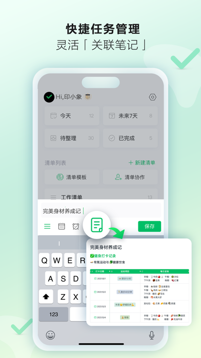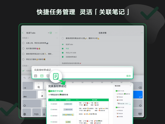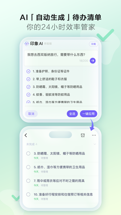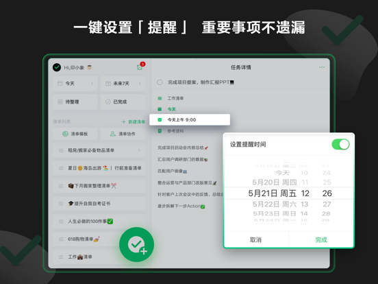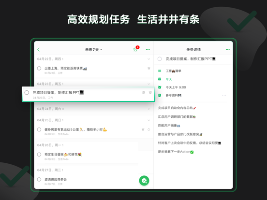 印象时间,是一款专注于日程管理及效率的高效App,我们致力于让你合理计划每一天,让时间产生更大价值。印象时间不仅支持添加任务、创建清单列表、设置提醒,帮助你制定项目计划、安排行程、记录备忘事项、设置番茄钟,还可以将任务直接关联到笔记,方便你直观便捷的管理待办事项,做好日程管理,查看清单备忘Todo,保持专注与高效。 -----印象笔记出品 【主要功能】 ※简洁创建待办Todo※ -随时随地灵活添加待办事项、Todo清单 ※关联笔记※ -印象笔记特有功能,你可以在清单内关联笔记,将清单内的任务与相关笔记资料建立关联,让备忘更强大,任务描述更清晰 ※日程管理※ 各类视图帮你更直观的查看计划、便捷排序。一拖一拽轻松制定每天计划、每周工作安排 ※日程邀约※ 一键邀请你的同事、好友共同参与日程。 ※番茄钟※ 沉浸式工作、学习,保持专注不分心。养成良好的专注习惯,告别拖延症 ※任务提醒※ 你可以为每个任务设置闹钟提醒,不再错过重要安排 --- 隐私声明 https://www.yinxiang.com/legal-privacy/evertask/ 服务条款 https://www.yinxiang.com/legal/tos.php 【联系我们】 微信公众号&客服通道 @印象笔记 微信服务号@我的印象笔记 微博@印象笔记 微博服务号@我的印象笔记 关注印象笔记,获取更多高效指南 微信视频号@印象笔记 Bilibili @印象笔记【体验及性能优化】 -解决了部分已知问题并增加了APP功能稳定性