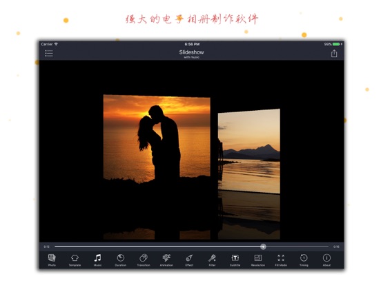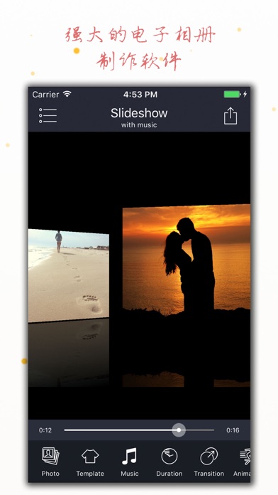 真正最强大的电子相册制作软件!全新电子相册大师搭载最先进"HD Slideshow 引擎",带给您前所未有的完美电子相册制作体验! - 简单易用,轻松上手 4步完成电子相册制作 1. 加入多张照片 2. 选择一种模板,调整照片转场,动画,动态场景等 3. 选择背景音乐 4. 保存或者分享给朋友 - 生动逼真的动态艺术场景,让一切比记忆更美好 动态星空,萌萌的心,花瓣飘落,儿时的纸飞机,五彩的肥皂泡等几十种场景特效让画面更美好。 - 震撼的转场特效 超过150种转场特效,支持转场特效最多的手机电子相册制作软件,没有之一。 - 支持音乐模式 根据歌曲长度自动生成音乐相册 - 多种字幕展示效果,让相片内容更丰富 - 支持1:1, 16:9, 4:3, 9:16 等主流宽高比 - 支持高达1920x1080, 1280x1280 等 HD分辨率 - 顶尖渲染引擎 即使特效全开,HD分辨率,仍然拥有极速输出- minor fixes
