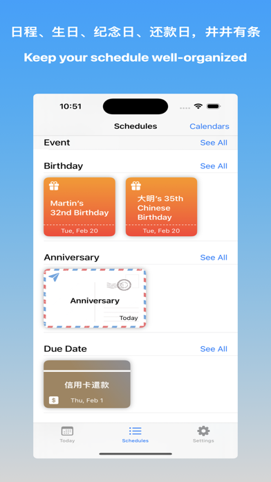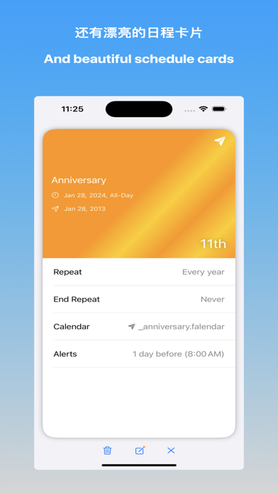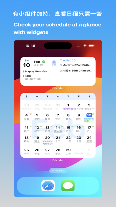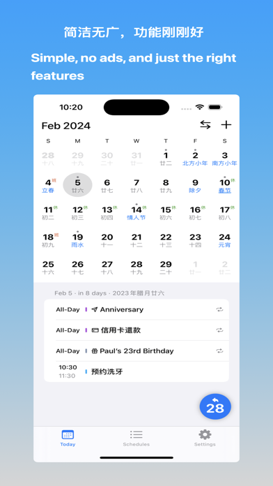 简洁无广告,功能刚刚好。 历法全、节日多 - 支持公历、农历、伊斯兰历、希伯来历、波斯历、日本历、佛历、印度历等历法 - 支持中国大陆节假日及调休 - 支持伊斯兰历节日、希伯来历节日、波斯历节日 支持小组件 - 支持展示当天日程、整月日程,无需打开App,所有日程一览无余 支持复杂日程 - 支持农历生日、伊斯兰历生日、希伯来历生日 - 支持设置每月不固定的还款日(例:账单日是11号,还款日是20天之后,每月天数不同导致还款日不固定) - 支持为日程设置各种重复规则、支持5次提醒 - 支持普通日程、生日、纪念日、还款日 - 支持快速跳转到指定日期(公历、农历等历法日期) 数据不怕丢 - 所有数据都保存在系统日历及联系人中,多端自动同步 - 即使卸载Falendar数据都还在,可通过系统日历、联系人查看 ---- 付费功能提示: - 自定义重复规则 - 自定义提醒时间 - 农历、伊斯兰历、希伯来历生日 - 基于账单日的还款日 - 小组件日程显示功能 ---- 使用条款:https://www.apple.com/legal/internet-services/itunes/dev/stdeula/ 隐私政策:https://x.thedafeige.com/wiki/wikcnv04reP5lJdrocbtS6SrBne- 解决“部分地区内购项目无法加载、内购流程无法完成”的问题