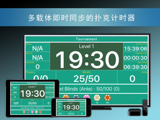 可在多设备同步的扑克计时器! 扑克比赛的时间、筹码、玩家信息将被自动同步到iPhone,iPad,Apple TV各个设备。不论是大型多人桌比赛或是一桌的小比赛都可以利用这套系统。您无须担心电脑和电视的连接线以及任何麻烦的操作! 此外,这套扑克俱乐部系统将会为您管理比赛、盲注结构、会员以及参赛玩家等所有的扑克俱乐部营运中的全套流程,为您剩下成本和时间,提高效率! 最终用户许可协议(EULA): https://www.apple.com/legal/internet-services/itunes/dev/stdeula/新功能 - 支持最新的 iOS 版本 - 新增计时器底部新聞的颜色设置功能 - 新增联系我们的邮件发送功能 - 新增最新通知展示功能