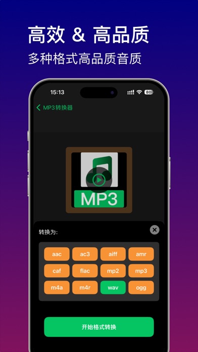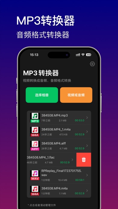 《MP3转换器》是一款强大的工具应用,让您可以轻松从视频文件中提取高质量的音频文件。无论您是想提取背景音乐、对话内容,还是音效素材,《MP3转换器》都能满足您的需求。 主要功能: •视频转音频: 从各种视频文件中提取音频,无需复杂操作,一键完成。 •多种格式输出: 支持多种音频文件格式输出,包括 MP3、AAC、WAV、AIFF、CAF 等,满足不同使用场景的需求。 •高速提取: 采用先进的算法技术,提取速度极快,让您无需长时间等待。 特点: •高效便捷: 简单直观的用户界面,轻松上手,几步操作即可完成音频提取。 •多格式支持: 无论您需要哪种音频格式,《MP3转换器》都能满足,提供多种输出选择。 •极速提取: 领先的技术保障,音频提取速度快,效率高,让您的工作更加高效。 使用场景: •创作者: 提取视频中的背景音乐或音效素材,用于创作新作品。 •学生: 提取教育视频中的音频,便于随时随地进行学习和复习。 •影音爱好者: 提取喜爱的电影、电视剧中的经典台词和音乐,收藏或分享。 立即下载《MP3转换器》,体验快速、高效的音频提取服务,让您的多媒体处理变得更加简单! 隐私政策: https://docs.qq.com/doc/DUnhmT3hwZ1J3SnNX 用户协议: https://docs.qq.com/doc/DUlBZTkdTaVFKYndX优化了一些细节,并且提高转换效率