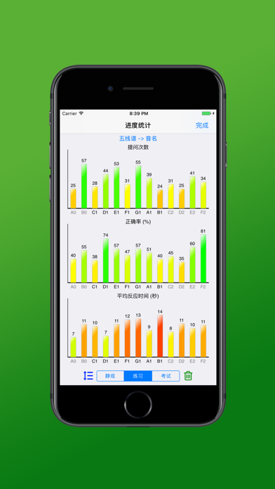 一个音符,有不同的表现形式:五线谱上的一个符号,一个琴键,一个音名,一个唱名,一个柯尔文手势,或者,本质上,就是一个声音。我们的各种音乐实践(视奏,视唱练耳,作曲,乐理研究,等等)都涉及到音符在这些不同方式之间的转换。《练音符》正是一款辅助你练习这些转换的简单而实用的应用。 功能特色: • 通过麦克风实时识别音高,您可以用真正的乐器来练习 • 支持MIDI有线连接到MIDI设备或乐器 • 虚拟钢琴全88键支持 • 20种问答方式任意定制(例如,如果你想增强视奏能力,除了练习从五线谱到键盘,你也可以倒过来练习从键盘到五线谱,这种逆向学习可以增强您的记忆。) • 使用科学音调记号(Scientific Pitch Notation,简称SPN,国际上常用的音高分组标记法。使用一个表示所在八度的阿拉伯数字,明确标出音符对应于键盘的位置,这样,再也不用纠结于分不清是哪个八度的音符了) • 三种训练模式:静观,练习,和考试 (其中,静观模式适用于“懒人”或者初学者,可只浏览,不用答题。考试模式可用于自我水平测试) • 支持音符查询模式 • 答题节奏任意调整:可以手动也可以自动出题,可以任意调整答题时间,正确答案显示时间等 • 学习目标任意定制:可调整音符范围,筛选任意音符或变音记号 • 保存每个音符的学习程度统计信息(提问次数,正确率,反应时间) • 基于统计信息智能学习(提问少,容易错,或者反应慢的音符会优先提问) • 可在五线谱上使用滑动手势输入变音记号 • 高音质(声音文件由美国爱荷华大学电子音乐工作室录制于斯坦威钢琴)• 现在支持MIDI有线连接到MIDI设备或乐器 • 一些小的改进