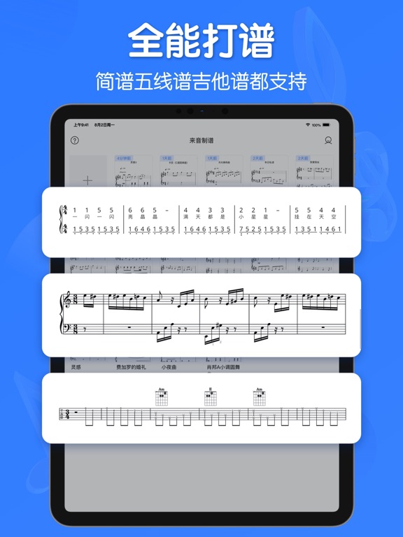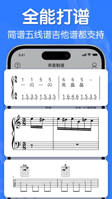 这是一款简单易用的乐谱制作软件,专为音乐爱好者和专业音乐人设计。简洁的键盘输入法,通过敲击所需音符即可生成乐谱。你也可以通过AI拍照识别功能,快速生成智能乐谱,支持五线谱转简谱。 【编谱能力强】 可创建编辑钢琴、吉他、古筝、小提琴、尤克里里,声乐等乐谱,支持多part自定义乐谱编辑、五线谱/简谱/六线谱/弹唱谱/四线谱输入。 支持歌词、指法、小节、线、装饰音、奏法、力度、记号等元素输入,让你可以轻松创作出美妙的音乐作品。 【智能拍照识谱】 如您有纸质乐谱,无需再亲自动手打谱,只需打开《来音制谱》 选择拍照上传,即可生成AI数字乐谱,更便于日常使用和携带。 【乐谱能播放】 支持乐谱的播放功能,编辑完乐谱之后,你可直接播放聆听你的作品,这将帮助你更好地预览和修改你的作品,极大的提升创作效率。 【操作简单高效】 自研科学高效的键盘输入法,各种音符、记号按键布局简洁明了,操作简单,上手快,让你创作乐谱更加得心应手,效率翻倍。 【可导出分享】 支持导出为PDF、MusicXML、来音乐谱、图片等格式文件,让你可以随时保存和分享你的作品到来音旗下app或是其他音乐软件。 --------- 隐私政策:https://base.quthing.com/base/agreement/privacy.html?appPackage=editscore_ios&appChannel=AppStore 用户协议:https://base.quthing.com/base/agreement/user.html?appPackage=editscore_ios&appChannel=AppStore 会员协议:https://base.quthing.com/base/agreement/vip.html?appPackage=editscore_ios&appChannel=AppStore1. 添加画谱排版配置项 2. 支持水印,优化问题