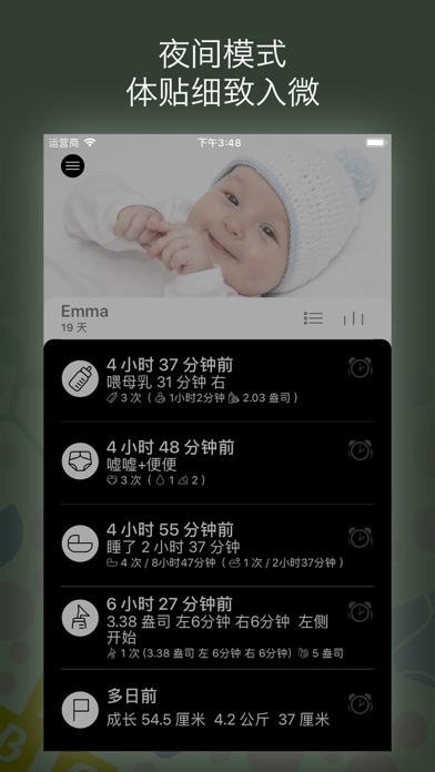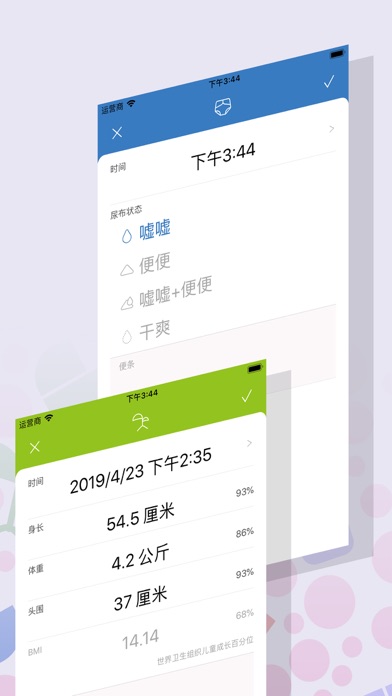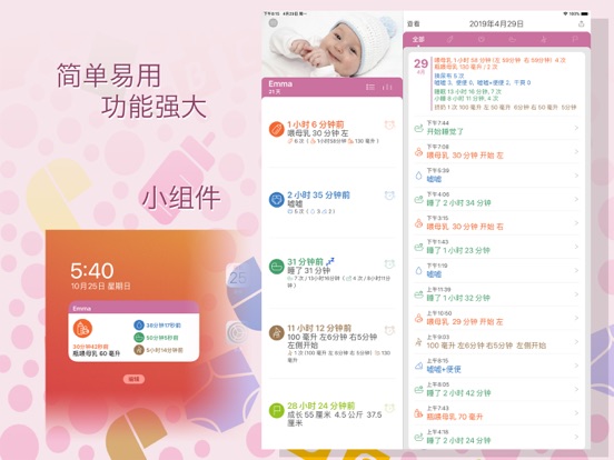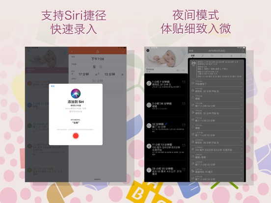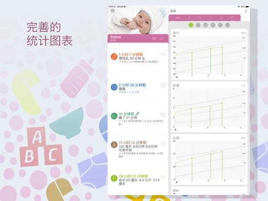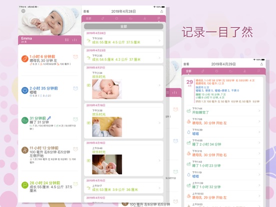 “宝宝生活记录”专注于记录和统计新生宝宝的日常生活,帮助您定量了解和分析宝宝成长状况,并能随时记录宝宝生活中的趣事。 “宝宝生活记录”已对iOS 16进行优化。 “宝宝生活记录”提供两个版本: 版本一:免费版 可永久免费使用全部功能,但将显示广告。 版本二:内购升级为完整版 去除广告 1、功能全面 “宝宝生活记录”能对宝宝的生活轻松记录、编辑和统计分析,并能在多设备间同步数据,也能方便的导出、打印数据和图表。“宝宝生活记录”包括宝宝今日(主页)、记录、编辑查看、统计四大主要模块,具体包括如下内容: * 哺乳喂食--可记录母乳,母乳瓶喂,配方奶,辅食的记录和统计,能自定义食物种类和数量;母乳可计时方式记录;能设置闹钟提醒下次喂食时间。 * 换尿布--可记录嘘嘘、便便、混合和干爽四种状态,并能设置闹钟提醒下次换尿布时间。 * 睡眠--可计时方式记录,并能设置闹钟提醒下次睡眠时间。 * 成长--除了记录宝宝身高、体重、头围数据,更在统计图中反映世卫组织(WHO)百分位曲线,方便评估宝宝的成长状态。 * 里程碑--可记录宝宝成长过程中的重要事件,通过拍照来留下美好瞬间。 * 欢乐时光--通过照片和文字来记录宝宝生活的点点滴滴。 * 其它活动--可自定义适合宝宝的任何记录项,可计时方式记录。 2、方便易用 “宝宝生活记录”的丰富功能均能方便快速地实现。根据移动设备的特点分别为iPhone和iPad优化的界面和操作方式,让您记录、查看、编辑等操作能通过最简单的步骤完成。 3、支持记录多个宝宝的活动 可以方便地记录和管理多个宝宝的生活 4、完善的数据同步和备份 连接宝宝生活记录服务器,提供稳定的数据同步。同时有iCloud或Dropbox两种云同步/备份方式可选,更灵活。 5、支持数据和图表的打印、email、导出(csv格式) 6、贴心的夜间模式,让您在夜间也能轻松操作* 改进了app易用性 * 修正了一些bug