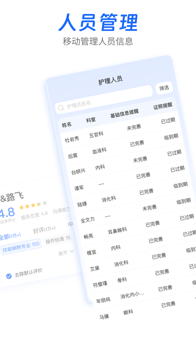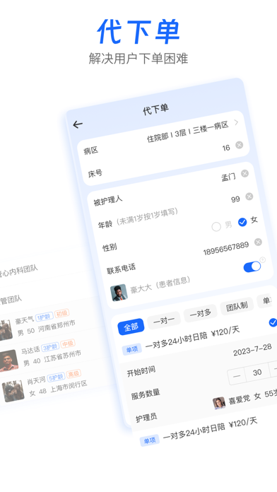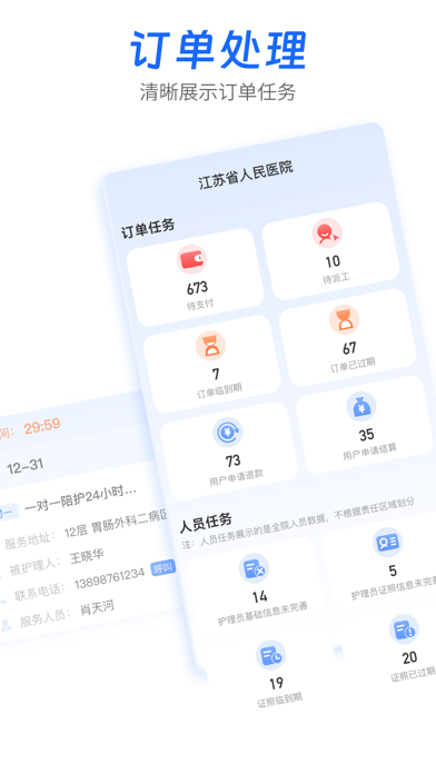 管理人员功能 【服务站点管理】商品上架发布、服务医院/楼层/科室/床位配置等 【订单管理】评估、派单、转单、代下单等 【财务管理】收退费、工资核算等 【人员管理】考勤、考核、培训、入转调离、档案管理等 【数据报表】人员绩效、满意度等 服务人员功能 接单履约、查看收入和提现等 客服热线:400-8933-120解决了一些已知问题。
