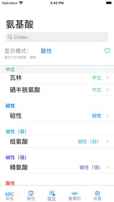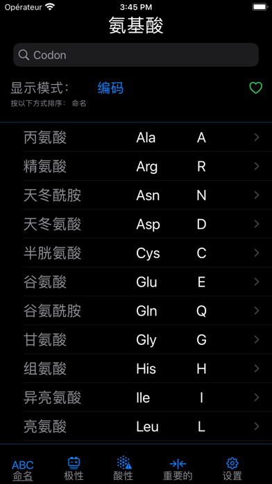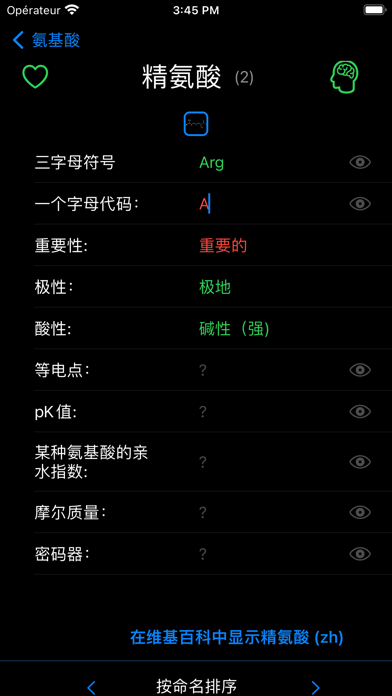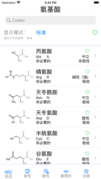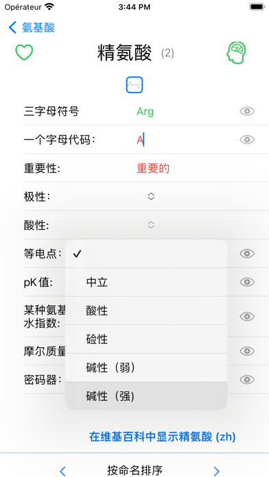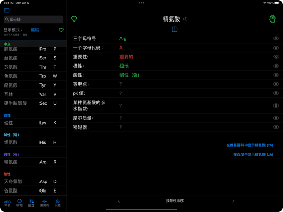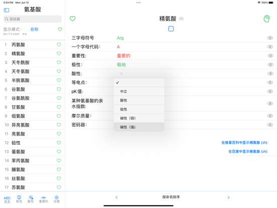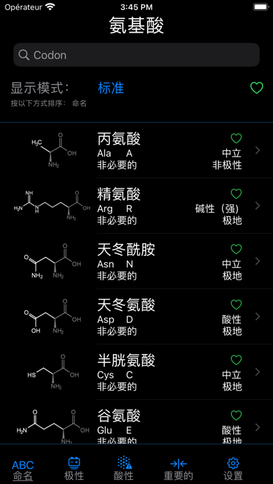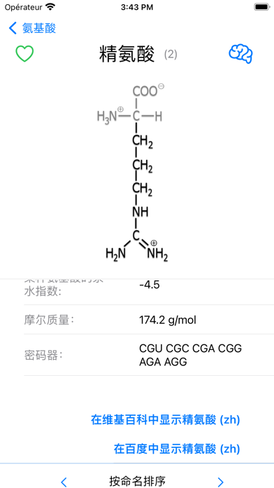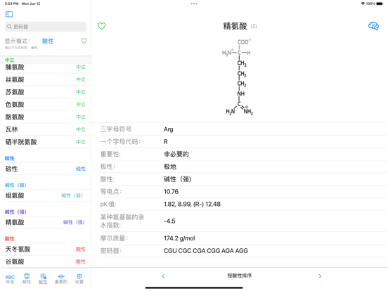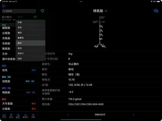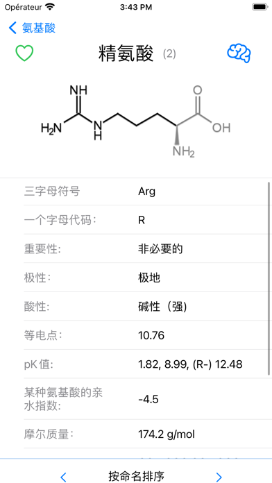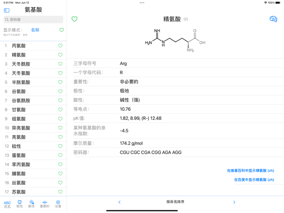 iAmino 经过精心设计,可帮助您学习和查询有关原生氨基酸的最重要事实。 iAmino 可帮助您学习蛋白质的组成成分,并帮助您掌握相关知识--一切尽在其中。 可在 iPhone、iPad 和 Mac(硅胶)上运行。具有漂亮的夜间模式。 我们从头开始制作这款应用程序,并添加了学习模式,帮助您记忆相关知识。 每个事实表都包含维基百科的直接链接,以备您需要更多细节。 如果您愿意,可以将 iAmino 的显示语言更改为支持的语言之一(目前有英语、德语、法语、中文和西班牙语)。 iAmino 可帮助您掌握不同的氨基酸。 - 化学结构(楔形线和价态结构式) - 三字母代码 - 单字母代码 - 极性 - 酸度 - 等电点 - pK 值 - 水化指数 - 摩尔质量 - 密码子(包括密码子搜索) - 本质 - 化学式 - 备注栏[新增] 可编辑文本框,为氨基酸添加自己的注释 [新增】维基百科文章链接现在可以使用不同语言。 您可以选择德语、英语、西班牙语、法语、意大利语、日语、韩语、荷兰语、俄语、瑞典语和中文。 [新增] 每种氨基酸的化学式 [新增] 大量布局改进 [修正] 天冬氨酸中显示错误图像的问题