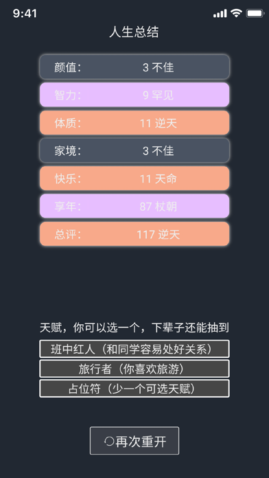 余生模拟器是一款能够让你不断轮回模拟人生的模拟工具,从天赋开始选择,模拟一个人的全部生命轨迹,在这个虚拟的世界可以体验到非常奇趣的人生体验玩法,让你能够在这个过程之中获得一段精彩的人生,各种各样的模拟玩法可以带给你不一样的游戏体验,带来真实的人生重开体验。 在这个余生模拟器里,你可以: - 自由选择出生,成为你心中最理想的人生模样 - 选择人生属性,天赋体质出身由你决定 游戏可以体验无数次,也会产生无数次不同的结果,想要玩的出彩,还得动动脑筋 -优化体验,只为最好的模拟体验