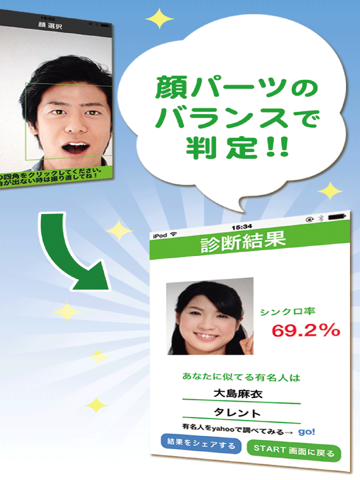 热门话题颜诊断App完整版新登场!! 使用了机场等颜认证系统, 可以找到与你相似的名人。 现已登录的名人数据有2198名。 (2014年11月17日现在) 予定会随时增加数据登录〜 还可以把检出的照片做成有趣的恶搞图片哦! 当然还具备了把诊断结果通过Twitter、LINE或者Facebook传送给朋友的功能哦! ################################### 使用方法 1.首先,选择名人脸诊断或者制作恶搞图片 2.选择名人脸诊断的场合,请再选择女性或者男性 (如果选择的性别是中性,检索的对象将会是所有人) 3.这个时候相机会启动,请拍摄照片,然后再按下面的「写真を使用」文字。 4.接着自动移到「顔選択」画面,会出现一个绿色的框,请按一下这个框。 5.恶搞图片制作的场合,可以选择拍摄或者相册的任意一个。之后的顺序就和名人脸诊断的场合是一样的。 【注意事项】 ・本App并不是可以十分准确的诊断软件。   请大家作为娱乐软件来使用。 ・因为登录了大量的数据,所以有可能会被检出表情类似的名人脸。 ・本App拍摄的照片不会被保存。 Apple 已更新此 App 以显示 Apple Watch App 图标。 BugFix