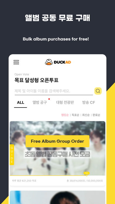 ● 您的投票将为您最喜爱的偶像创造难忘的时刻! [每月为偶像送上真实奖杯] [纽约时代广场广告、影院品牌广告、地铁广告等专属礼物] [通过流媒体赞助支持复出宣传] [首周销售期间众筹免费批量购买专辑] 所有这一切都可以通过 DUCKAD 实现,这是一款终极必备的 K-pop 投票应用程序! ● “本月最佳偶像组合”奖杯投票——为顶级偶像组合投票,并观看他们获得官方奖杯! - 欣赏独家偶像应援视频和获胜者访谈。 (由韩国领先的娱乐和体育媒体《今日体育》支持。) ● 月度人气投票海量广告回报 【月度排名投票福利】 ▷MEGABOX 弘大品牌剧场 &电影前预告片广告 +纽约时代广场广告牌广告 +江南站宽屏灯光广告 +乐天世界购物中心媒体吊灯巨型数字广告牌 +蚕室站 CM Board 广告 +合井站 Vision Screen 广告 ● 通过流媒体赞助支持你的偶像的回归! -您赞助的越多,您的偶像获得的流媒体播放次数就越多! -使用 DUCKAD 帮助她们成功回归! (支持 Melon、Genie、Bugs、Spotify、YouTube MV) ● 免费批量购买专辑! - 预先资助投票,参与第一周销售期间的免费集体专辑购买活动。 -与 Ktown4u 合作,所有购买均计入 Ktown4u 排行榜、Hanteo 排行榜和 Circle 排行榜(包括线上和线下销售)。 ●无与伦比!轻松获得免费投票的方法! - 观看视频、点击横幅并轻松收集大量免费投票! ● DUCKAD 是支持你的偏见的终极方式!现在就开始! ● 男子组合提名 ZEROBASEONE、Seventeen、WayV、ONF、TREASURE、ENHYPEN、HORI7ON、BOYNEXTDOOR、BAE173、GOT7、NTX、AHOF、PLAVE、CLOSE YOUR EYES、NEXZ、FANTASY BOYS、XODIAC、ONE PACT、INFINITE、EXO、TWS、TOMORROW X TOGETHER、&TEAM、PENTAGON、CIX、NCT 127、NCT DREAM、AMPERS&ONE、ATEEZ、BIGBANG、ASTRO、RIIZE、SHINee、NCT WISH、Stray Kids、BTS、SF9、CRAVITY、SUPER JUNIOR、TEMPEST、EVNNE、8TURN、XLOV、The Wind、DAY6、OMEGA X、TNX、Golden Child、BTOB、WEi、THE BOYZ、AB6IX、B1A4、Xdinary Heroes、KickFlip、VIXX、YOUNITE、ACE、ONEUS、P1Harmony、n.SSign、MONSTA X、VERIVERY、Highlight、NOWADAYS、JUST B、EPEX、xikers、JO1、ATBO、Hi-Fi Un!corn、NouerA、LUN8、ARrC、POW、ALL(H)OURS ● 女子组合提名 TWICE、Kep1er、NMIXX、BABYMONSTER、FIFTY FIFTY、ITZY、BBGIRLS、DREAMCATCHER、(G)I-DLE、CSR、KISS OF LIFE、VIVIZ、aespa、BLACKPINK、ILLIT、LE SSERAFIM、EVERGLOW、IVE、triplesS、Lapillus、XG、STAYC、Red Velvet、MEOVV、RESCENE、LIGHTSUM、NiziU、UNIS、fromis_9、SECRET NUMBER、Billlie、OH MY GIRL、Apink、WJSN、QWER、YOUNG POSSE、WOOAH、PURPLE KISS、izna、BADVILLAIN、CLASS:y、TRI.BE、Hearts2Hearts、KiiiKiii [联系我们] -电子邮件:duckad2020@gmail.com -X:https:/x.com/duckad2020 -指南:http:/duckad.co.kr/xe/index.php?mid=duckad_faqNovember 6 • Stability improvements and bug fixes have been made.