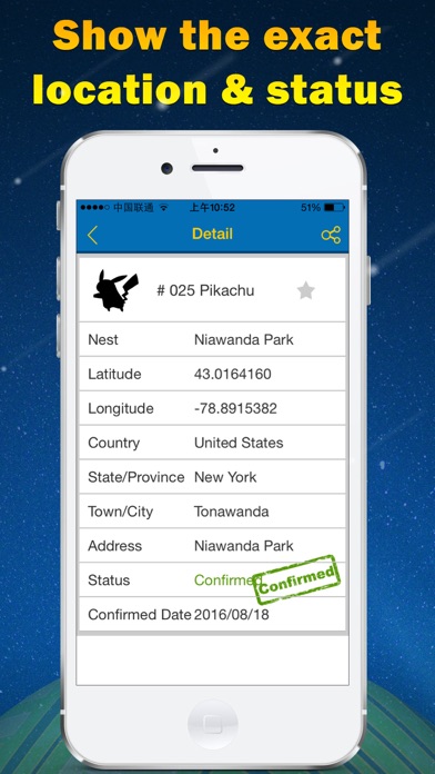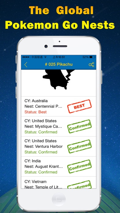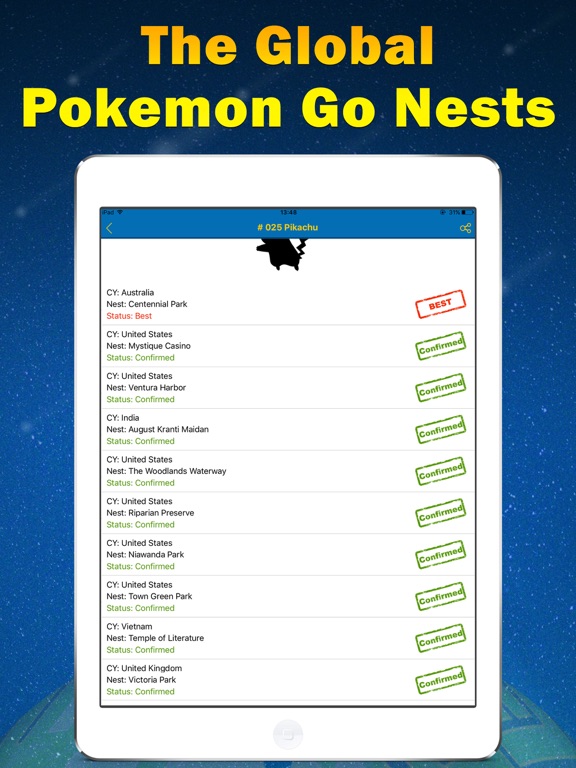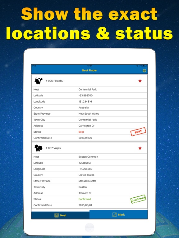 寻找精灵宝可梦中的精灵巢穴!直接查看稀有精灵巢穴的地图坐标和巢穴实时状态。 - 寻找全球范围内的精灵巢穴! - 单击条目可直接复制坐标。 - 根据小精灵过滤巢穴列表。 - 标记你最喜欢的精灵巢穴。 - 筛选最佳已证实巢穴。 立刻下载此应用程序,现在就出发去精灵巢穴捕抓小精灵! 声明 此应用非精灵宝可梦官方授权地图应用。应用中涉及的一切精灵信息和游戏资料版权归原公司所有。Apple 已更新此 App 以显示 Apple Watch App 图标。 Bug fixed.