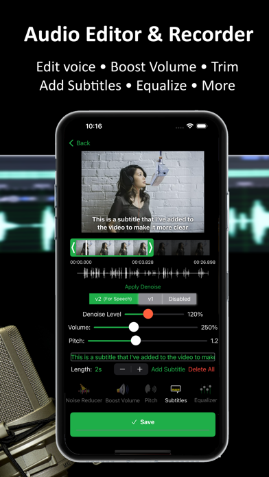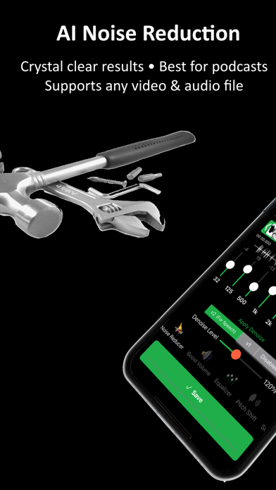 ByeNoise 是一款功能强大的音频编辑器和降噪工具,可完美清除音频/视频文件中的不必要背景噪音。它还可用作音频编辑器,让您编辑音频、修剪、剪切、增加音量、添加字幕、更改声音、调整声音频率、提高音量等。内置录音机可录制清晰的音频并对录音执行 AI 降噪算法。 轻松清除音频/视频文件中的不必要背景噪音(风声、嗡嗡声、口哨声、嗡嗡声、嘶嘶声、呜呜声、风扇噪音等),并增强重要声音(如扬声器、歌手或吉他)。然后轻松与朋友分享干净的结果。 “...我对结果感到惊讶,在我的录音中没有发现任何噪音痕迹”(iGeeksBlog) AI 降噪: * 只需轻轻一按即可从音频/视频文件中消除背景噪音 * 清除风声、嗡嗡声、口哨声、嗡嗡声、嘶嘶声、呜呜声、风扇噪音等噪音 * 从照片库、文件应用程序或 iCloud 加载文件 * 消除静电或电气噪音 * 在几种不同的智能 AI 降噪算法之间进行选择 一体式音频编辑器: * 智能图形均衡器,可获得更好的音频质量 * 修剪、剪切和执行其他视频/音频调整 * 语音转换器 * 音量增强器 * 将字幕嵌入视频 智能录音机: * 具有 AI 降噪功能的录音机,非常适合播客 * 获得清晰的录音并与朋友分享 * 使用我们的录音机创建有声读物或演讲,以获得清晰的声音录音 语音增强功能: * 选择“仅语音”可删除除扬声器以外的所有内容 * 除人声以外的所有内容都将被删除(如果您选择 v2-仅语音) * 如果您想保留除噪音以外的其他重要声音,请选择 v1 增强音量: * 执行降噪后,您还可以增强视频/音频中的重要声音 * 您还可以将该应用用作简单的音量增强器或均衡器,以增加文件的音量,而不管 iPhone 的音量如何 支持常见的视频/音频格式: * 加载 MOV、MP4、M4V、FLV、MKV、MPG、3GP 等视频格式 * 加载 WAV、MP3、M4A、M4B、AAC、AC3、WMA 等音频格式 * 或者只是使用我们出色的录音机创建您自己的录音 免责声明:此程序已经过测试和训练处理许多音频/视频文件,但自动消除所有类型视频的所有噪音是一项不可能完成的任务。它适用于大多数视频/音频,但对于某些视频/音频,它可能会失败(视频噪音太多或几乎听不到主扬声器的声音)。 注意:此应用程序的免费版本仅允许您对视频的前 30 秒(或更短的视频)进行降噪。如果您喜欢该应用程序,请考虑订阅专业版并获得无限功能。 在使用应用程序之前,请阅读我们的服务条款和隐私政策: * 服务条款 - https://ofirapps.blogspot.com/2021/03/video-noise-cleaner-terms-and-conditions.html * 隐私政策 - https://ofirapps.blogspot.com/2021/03/video-noise-cleaner-privacy-policy.html错误修复 性能提升