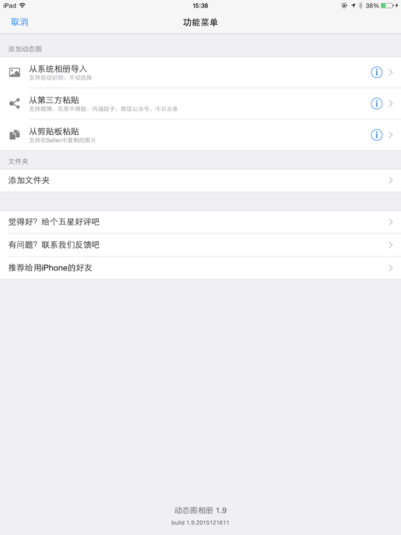 *【专业版独享】加密功能* 为打开应用或打开任意文件夹设置密码,保护你的隐私 9大核心功能:GIF播放、GIF保存、GIF分享、GIF压缩、文件夹管理、全网GIF搜索、全网GIF浏览、导入导出、GIF制作 *GIF播放* 解决系统相册不能播放GIF动态图的问题 支持从系统相册手动选择或自动识别导入,让原来不动的GIF动起来 *GIF保存* 解决从微博等应用中保存GIF文件损坏的问题 使用“快捷粘贴”功能,一键“正确”保存GIF 目前支持的第三方:1. 微博;2. 百思不得姐;3. 内涵段子;4. 今日头条;5. 微信公众号;6. Tumblr; 7. 贴吧 *GIF分享* 支持分享到:1. 微信好友;2. 微博;3. QQ好友;4. 邮件;5. 保存到系统相册 *GIF压缩* 支持动态图压缩,满足微信和微博分享的大小限制 *文件夹管理* 支持创建文件夹,给你的动态图分分类吧 *全网GIF搜索* 全网搜索动态图,只要你见过,就能把它搜出来,随时搜,随时用 *全网GIF浏览* 内置浏览器,看到GIF,长按保存 *导入导出* 与同一局域网中的电脑互传文件,可以方便的备份和恢复 *制作* 视频转GIF,Live Photo转GIF,连拍快照转GIF,图片制作GIF Bug修复 近期更新 1. 适配iOS 2. 暗黑模式 3. 样式bug修改