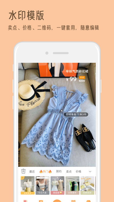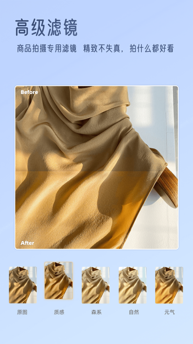 拍商品,用我拍衣。 专注商品实拍的相机app,网上卖货神器! 拍出让顾客怦然心动的图片,产品才能大卖哦! 【模版拍摄】 品牌水印、秒杀价格、店铺信息、活动海报... 多款模版一键套用,无需设计和排版,只需修改文字内容。 让你的产品图内容更丰富、风格更突出。 【风格花字】 多种风格字体和样式,一键加字,极简又灵活。 让顾客更容易感知你产品的小细节、闪光点、以及使用体验。 悄悄说一句,恰当的文字点缀很有风格哦,会让你赢得年轻顾客的偏爱呢!网红达人们都在用! 【修图】 传图后应用模版、加字、滤镜,省时省心,效率加倍! 【高级滤镜】 商品拍摄专用滤镜,精致不失真,拍什么都好看! 我拍衣相机app,守护您的大卖之旅。 立即下载体验吧!发现新版本: 1. 修改已知bug