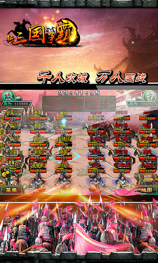 独一无二的战斗模式,热血沸腾的万人国战,让人欲罢不能!群雄兵戎战场见,万人攻城美名留!承袭三国辉煌,成就王者雄风!携名将一统天下,就待你我!