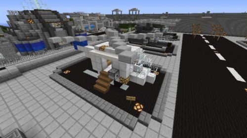 在这个图中军事基地建在两座大岛上(多亏了mcedit辅助地形),其中包括了东岛和西岛,西岛主要是机场,包括了滩头堡,跑道,机库等等建筑,而其他设施主要在东岛,包括兵营,饭堂,军械库,射击场,码头还有地下基地