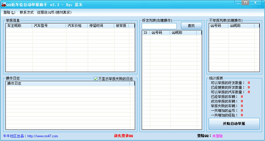 本软件是QQ抢车位的一个自动举报工具软件,采用多线程的举报方式,让QQ抢车位举报更快捷更方便。本软件并不是抢车位刷钱外挂,也不是抢车位刷经验外挂,只是在举报同时能增加抢车位的收入与经验,目的只是为了节省在抢车位上的举报时间。本软件操作简单,只需登陆一下,然后点一下"开始自动举报"即可完成抢车位的自动举报功能,多线程全自动一键举报车辆,数秒内可举报几百辆汽车。市面上最快的抢车位自动举报工具,整个举报过程在一分钟内可以完成,大大节省了操作时间.