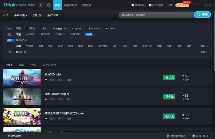 origin游戏助手合适一个可以购买并下载各类电脑游戏的pc端助手平台,在这里你可以看到众多热门端游,包含绝地求生、战地系列、FIFA系列、中国式家长等数款游戏,平台折扣优惠力度大,新人优惠福利多。