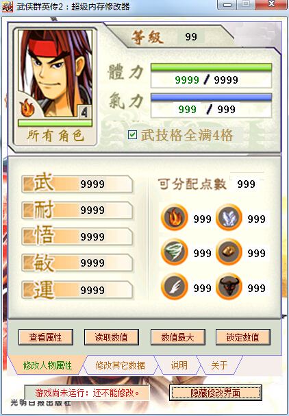 3.武、耐、悟、敏、运这几项修改项目,在角色没有装备任何装备时,修改器读取的数值和修改后的数值等于游戏中的数值,装备了装备后,游戏中的数值会发生改变。