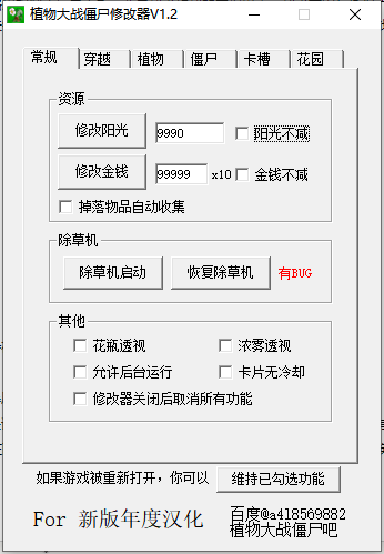 植物大战僵尸无尽版修改器是专为电脑版《植物大战僵尸无尽版》打造的辅助工具。玩过《植物大战僵尸》的朋友都知道阳光是很重要的,没有阳光就不能建造植物了。通过该修改器,可以把你的阳光变为无限,各种植物随便造,疯狂打僵尸。作为一款经典的塔防游戏,植物大战僵尸中有数十个关卡和不同的模式,玩家可以在花园、常规、无尽等模式中选择。用创造力和无限可能改变游戏规则,让你成为最强的植物守护者!立即下载植物大战僵尸修改器,开启你的超能植物之旅!赶快体验吧!
