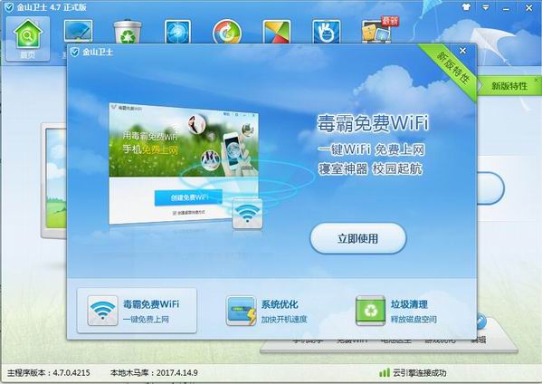 它采用金山领先的云安全技术,不仅能查杀上亿已知木马,还能5分钟内发现新木马;漏洞检测针对windows7优化,速度更快;更有实时保护、插件清理、修复IE等功能,全面保护电脑的系统安全。
