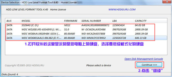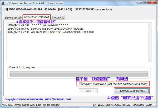HDD Low Level Format Tool(硬盘低格工具)4.4英文版的没有速度限制,对一些坏道严重的也能格过去,4.25中文版的有速度限制,坏道严重的低格过不去。