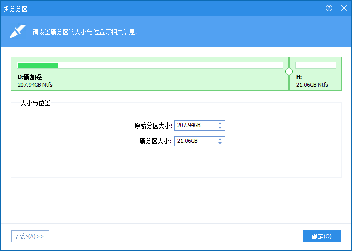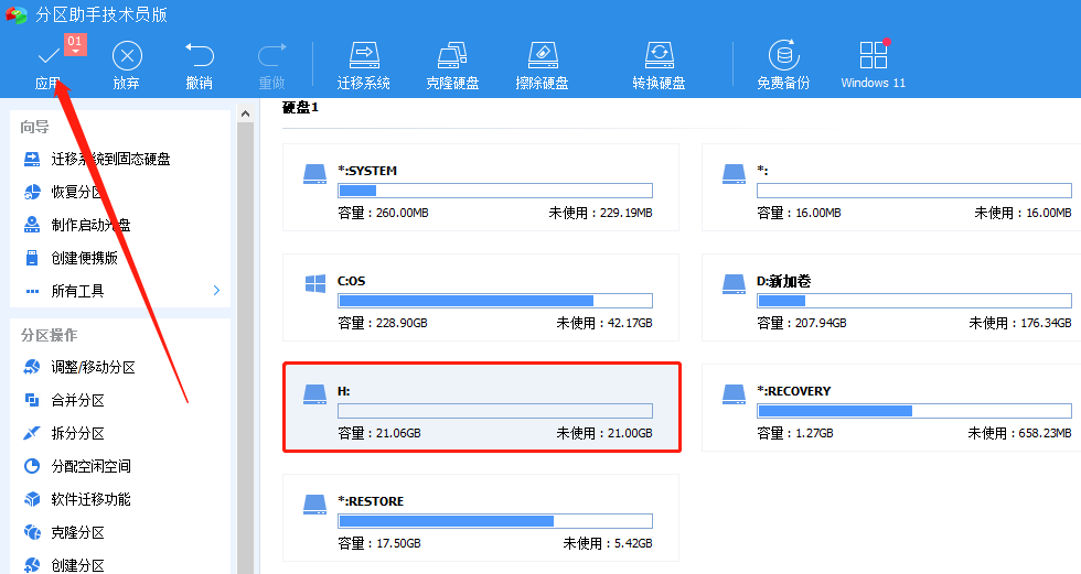 分完之后,就得到了一个未使用过的H盘,最后别忘记点击左上角“应用”,才能将拆分操作实际应用到磁盘中,否则是无效的。