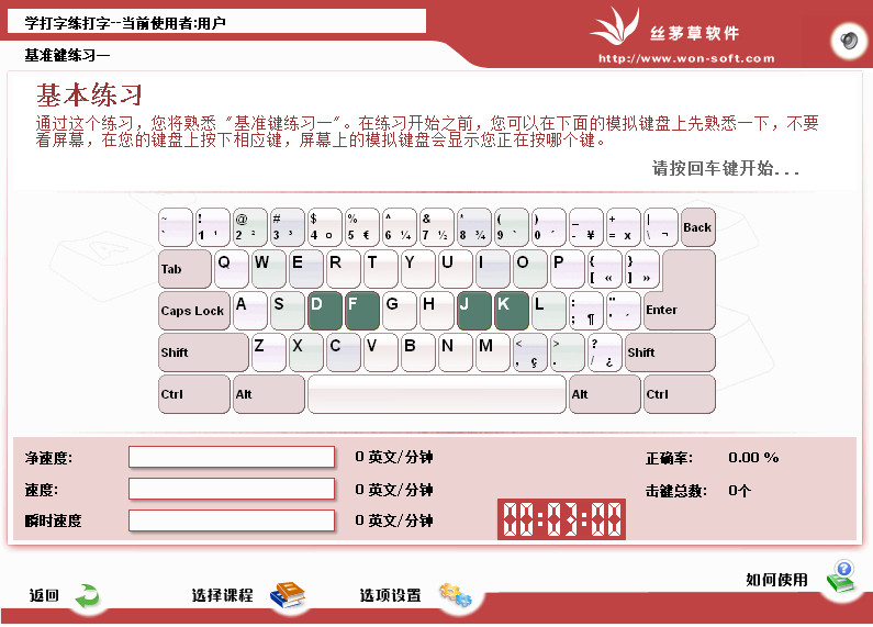 4、针对每套键盘精心设计了一套20多课的英文指法进阶学习课程,这套课程全面支持按键及手指实时提示,提供从最简单的基准键到专业的小键盘训练。