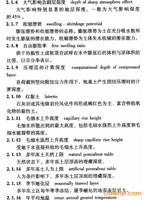5.新增了附录A黄土的地貌类型划分表、附录B黄之地层的堆积时代与特征划分表、附录C多年冻土的含水率与融沉等级对照表和附录D多年冻土季节融化土层的冻胀性分级划分表;
