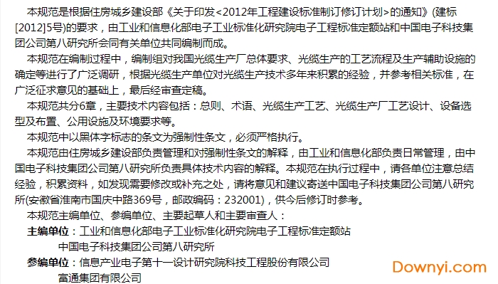 本规范是根据住房城乡建设部《关于印发2012年工程建设标准制订修订计划的通知》(建标[2012]5号)的要求,由工业和信息化部电子工业标准化研究院电子工程标准定额站和中国电子科技集团公司第八研究所会同有关单位共同编制而成。其中,第4.1.5、5.7.3、5.9.2、6.4.5条为强制性条文,必须严格执行。
