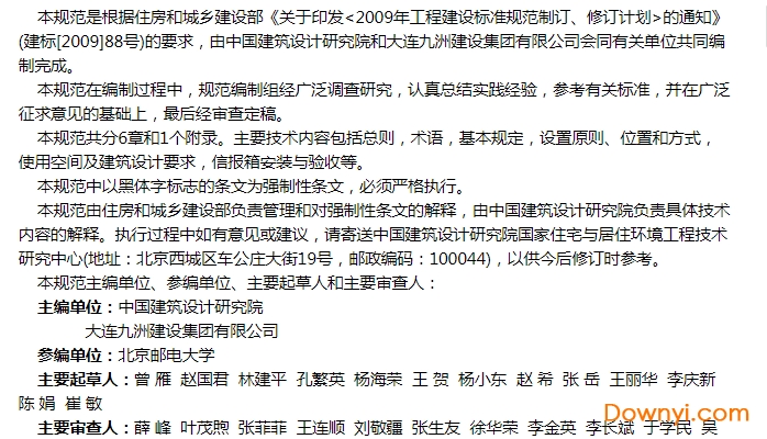 本规范由住房和城乡建设部负责管理和对强制性条文的解释,由中国建筑设计研究院负责具体技术内容的解释。执行过程中如有意见或建议,请寄送中国建筑设计研究院国家住宅与居住环境工程技术研究中心(地址:北京西城区车公庄大街19号,邮政编码:100044),以供今后修订时参考。