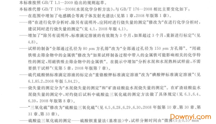 硫酸盐三氧化硫的测定--硫酸钡重量法(基准法)中,试样分解时间由“微沸(5士0.5)min”修改为“微沸5min~10min”(见6.5,2008年版第10章)。