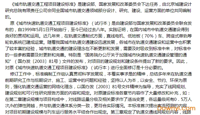 由北京城建设计研究总院有限责任公司会同全国城市轨道交通领域部分设计、研究、建设、运营方面的单位共同编制的。修订工作中,标准编制工作组认真贯彻科学发展观,本着实事求是的精神,总结多年来在轨道交通前期研究工作与后期设计、施工、运营中的问题和经验,坚持以人为本,以安全、节约、环保为原则,强化轨道交通运营的网络化理念,以国办发〔2003〕81号文件精神为指导,充实了线网规划、建设规划和可行性研究报告方面的内容和规定。