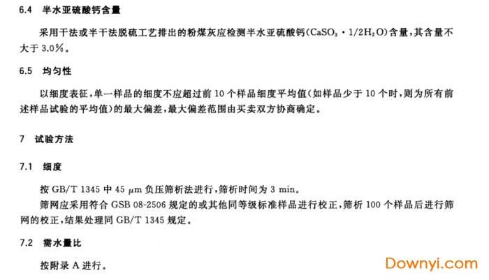 ——当采用干法或半干法脱硫工艺时产生的粉煤灰需检测半水亚硫酸钙含量,增加了规定指标及试验方法(见6.4和7.5);