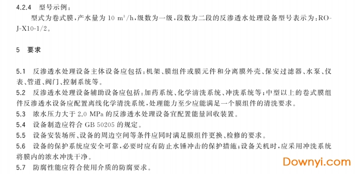 本标准规定了反渗透水处理设备(以下简称设备)的术语和定义、分类与型号、要求、试验方法、检验规则、标志、包装、运输与储存,适用于采用反渗透膜(卷式、碟管式)技术对水进行除盐、净化、分离处理的设备。