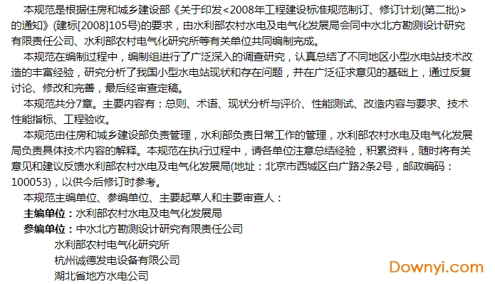本规范是根据住房和城乡建设部《关于印发2008年工程建设标准规范制订、修订计划(第二批)的通知》(建标[2008]105号)的要求,由水利部农村水电及电气化发展局会同中水北方勘测设计研究有限责任公司、水利部农村电气化研究所等有关单位共同编制完成。本规范在编制过程中,编制组进行了广泛深入的调查研究,认真总结了不同地区小型水电站技术改造的丰富经验,研究分析了我国小型水电站现状和存在问题,并在广泛征求意见的基础上,通过反复讨论、修改和完善,最后经审查定稿。