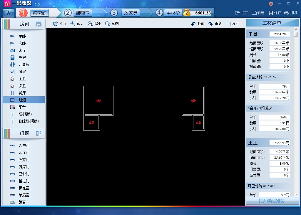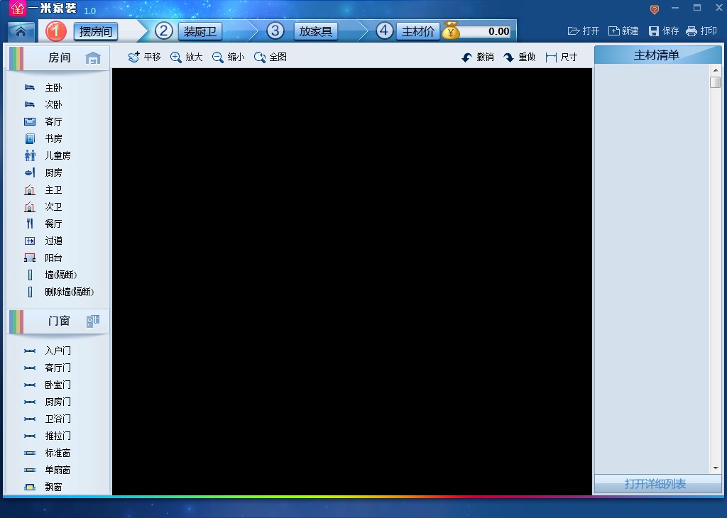 4.三步操作:摆房间.装厨卫.放家具,即可完成家装的主材及价格明细单.以及户型设计和家居摆设方案。