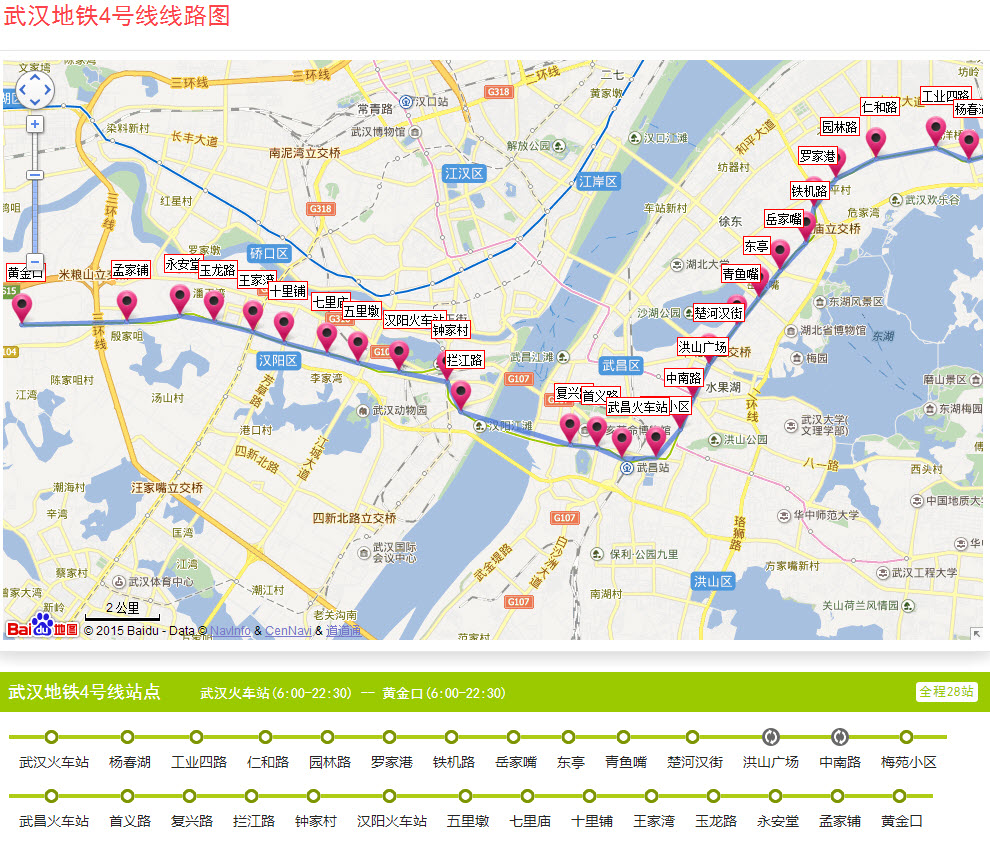 武汉地铁(Wuhan Metro):即武汉轨道交通,是服务于中国武汉市的城市轨道交通系统。第一条线路武汉轨道交通1号线于2004年7月28日开通。截至2015年12月,武汉地铁已投入运营1号线、2号线和3号线和4号线,共96座车站,运营里程123.4公里。武汉地铁4号线的开通,标志着在武汉形成了联络三镇的“工”字形的地铁网络,武汉、汉口、武昌三大火车站之间拥有了更便捷的换乘通道。